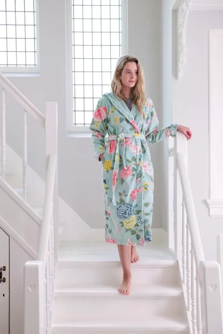 Deze Zachte Blauwe Badjas Is Versierd Met Het Good Evening Dessin Vol Kleurrijke Bloemen. De Badjas Heeft Steekzakken En Een Capuchon. De Badjas Dient Voor Gebruik Gewassen Te Worden Volgens Het Care Label.