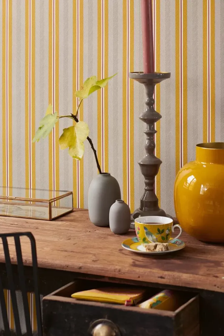 Wat Het Beige/Gele Blurred Lines Dessin Een Blikvanger Op Je Muur Maakt? Het Strepen Dessin Blurred Lines Heeft Een Grafische Streep Met Chevron Patroon. Deze Grafische Streep In Structuur Heeft Een Heel Subtiel Glanzend Streepje En Is Door De Uitgesproken Kleurstellingen Een Echte Pip Streep. Het Blurred Lines Dessin Is Makkelijk Te Combineren Met Bijna Alle Andere Dessins Uit De Collectie, Waardoor Er Een Leuk Mix & Match Effect Ontstaat. Het Pip Studio Blurred Lines Behang Is Verkrijgbaar In Verschillende Kleuren: Khaki/Roze, Oker/Karamel, Donkerblauw, Groen En Beige En Creeert Een Vrolijke Sfeer In Je Huis.