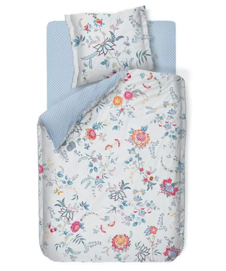 Het Vrolijke Witte Bloemendessin Van Dekbedovertrek Flower Festival Is Opgebouwd Uit Een Variatie Van Fantasierijke Rode En Roze Chintzbloemen Met Lichtblauwe En Groene Bladeren. De Speels Geplaatste Bloementakken Met Grote Gedecoreerde Bloemen En Bladeren Geven Dit Verfijnde Dessin Een Extra Rijke Beleving. De Achterkant Heeft Een Gestileerde Geometrisch Print.