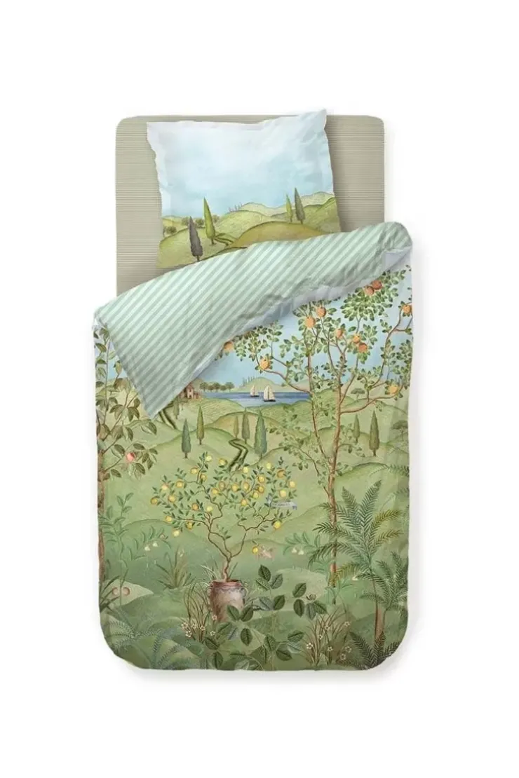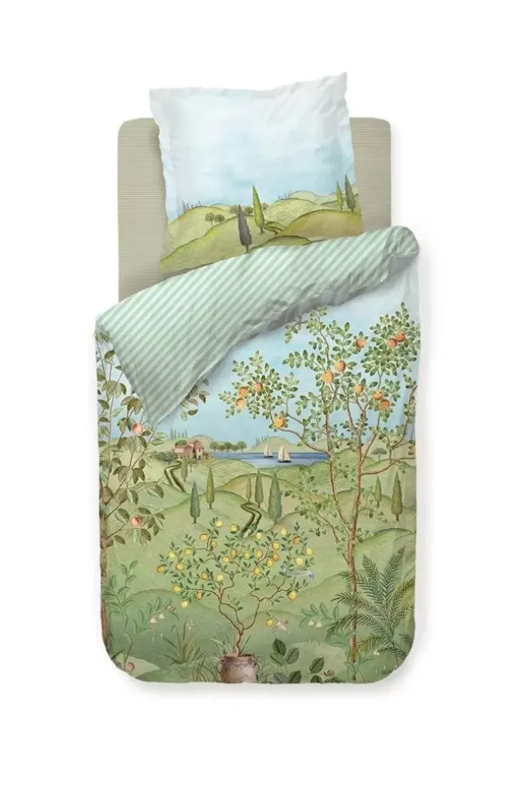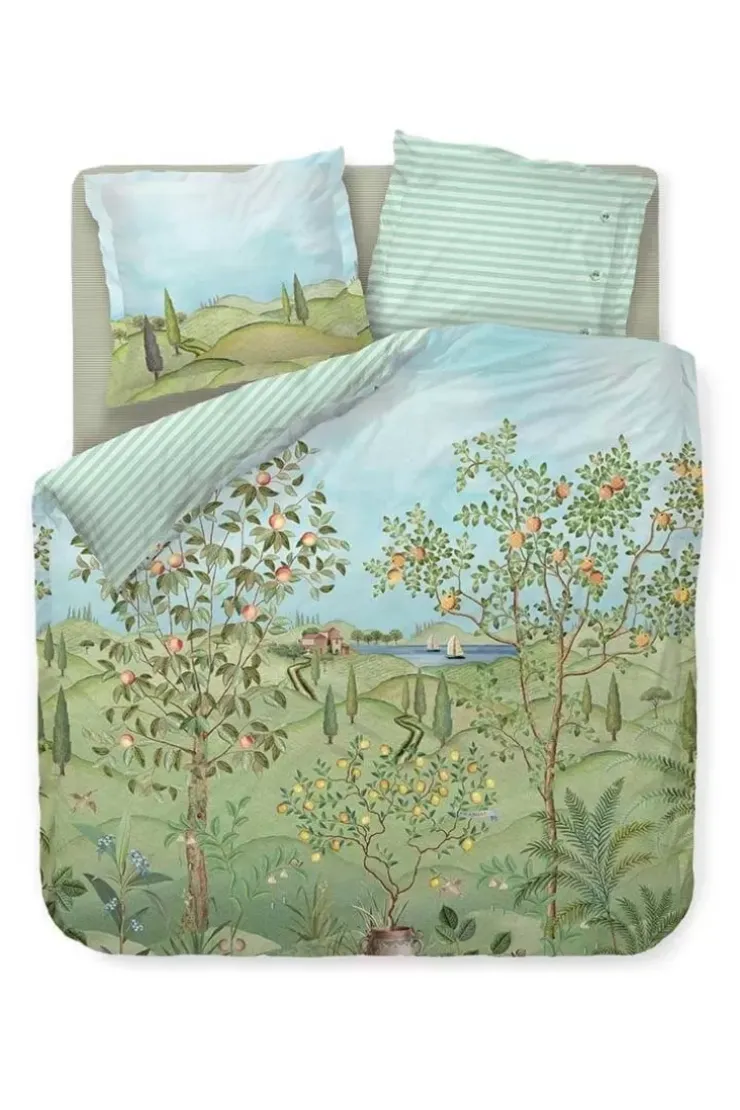 Het Groene La Campagna Dessin Bestaat Uit Een Fresco-Achtig Geschilderd Landschapsprint. In Het Midden Een Dromerig Toscaans Heuvellandschap Is Een Huisje Aan Het Meer Te Zien. De Achterkant Heeft Brede Horizontale Strepen Met Textuur. Het Overtrek En De Kussens Hebben Een Doorgestikte Oxford Rand Aan De Zijkanten, Wat Een Luxe Uitstraling Geeft. De Kussenslopen Hebben Een Gestoffeerde Knoopsluiting En Net Als Het Overtrek Twee Verschillende Kanten En Kun Je Tweezijdig Gebruiken. Zo Creeer Je Een Speels Mix & Match Effect Op Je Bed.