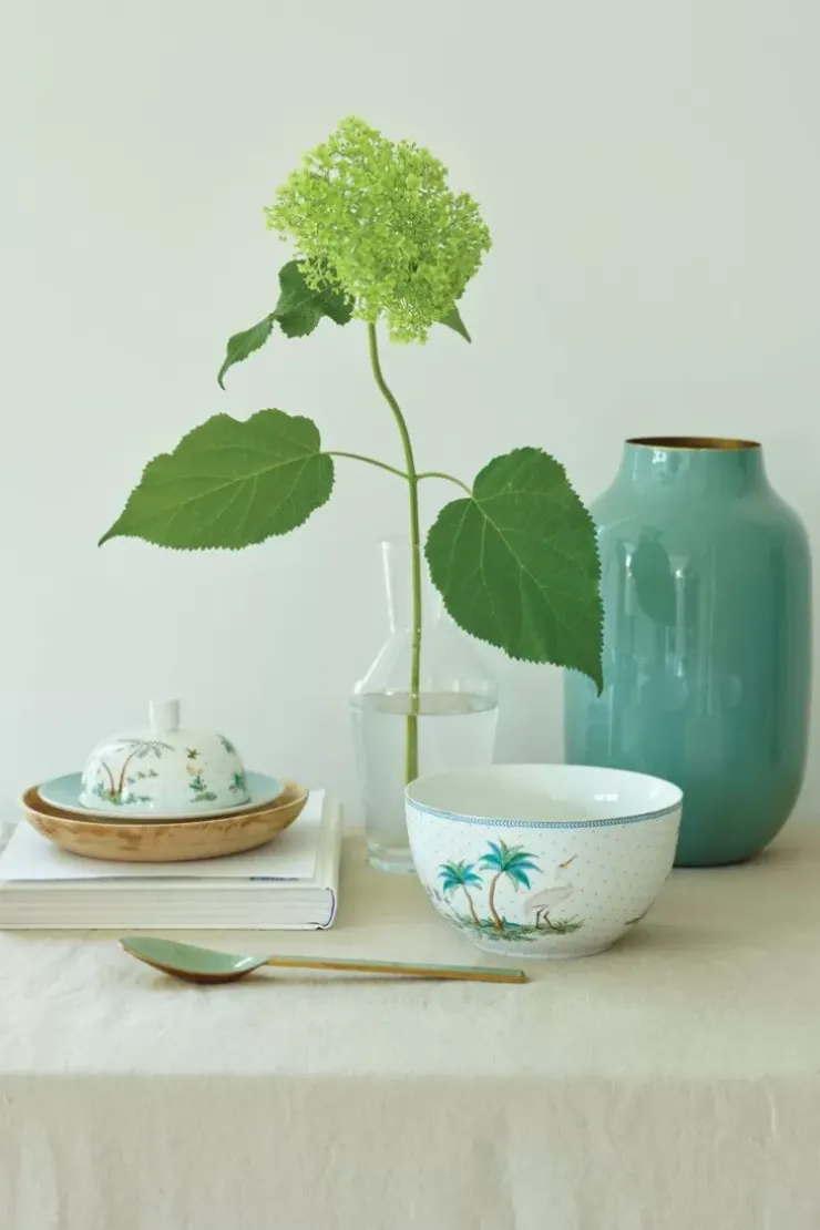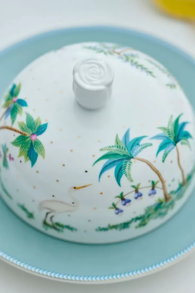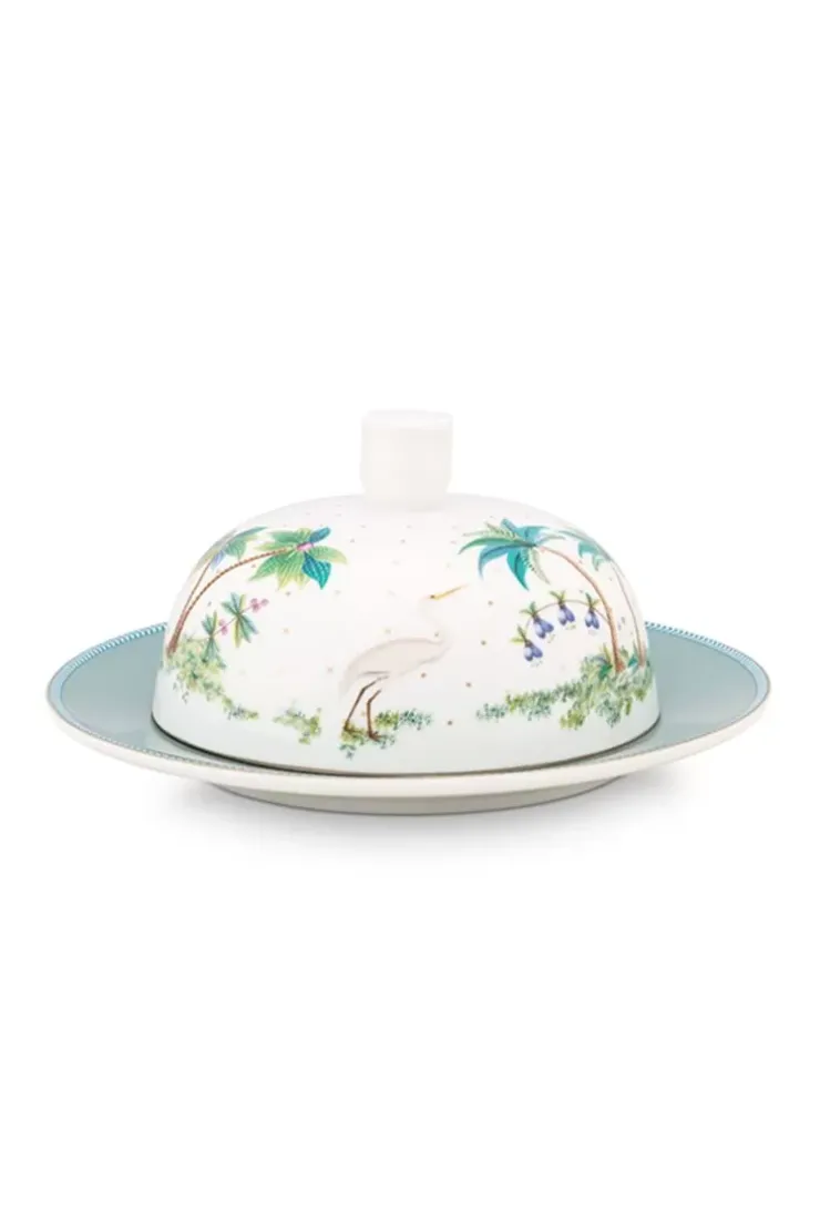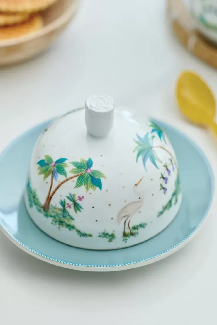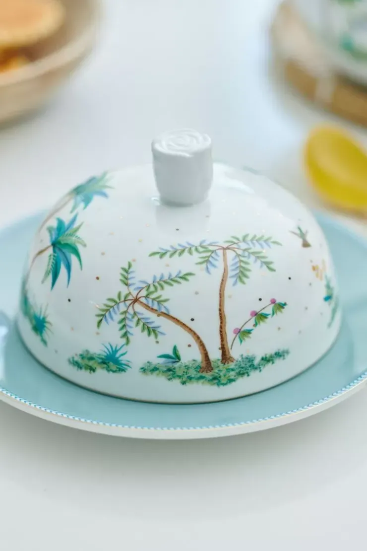 Deze Tropische Botervloot Uit Onze Jolie-Collectie Zal Je Tafel In No-Time Opfleuren. De Schaal Is Versierd Met Gouden Stippen En Heeft Een Dessin Van Verschillende Tropische Planten, Bomen En Exotische Soorten. De Schaal Heeft Een Blauwe Achtergrond En Past Perfect Bij Het Deksel. Combineer Deze Botervloot Met Andere Producten Uit Onze Jolie-Collectie Voor Een Stijlvolle Tafel.