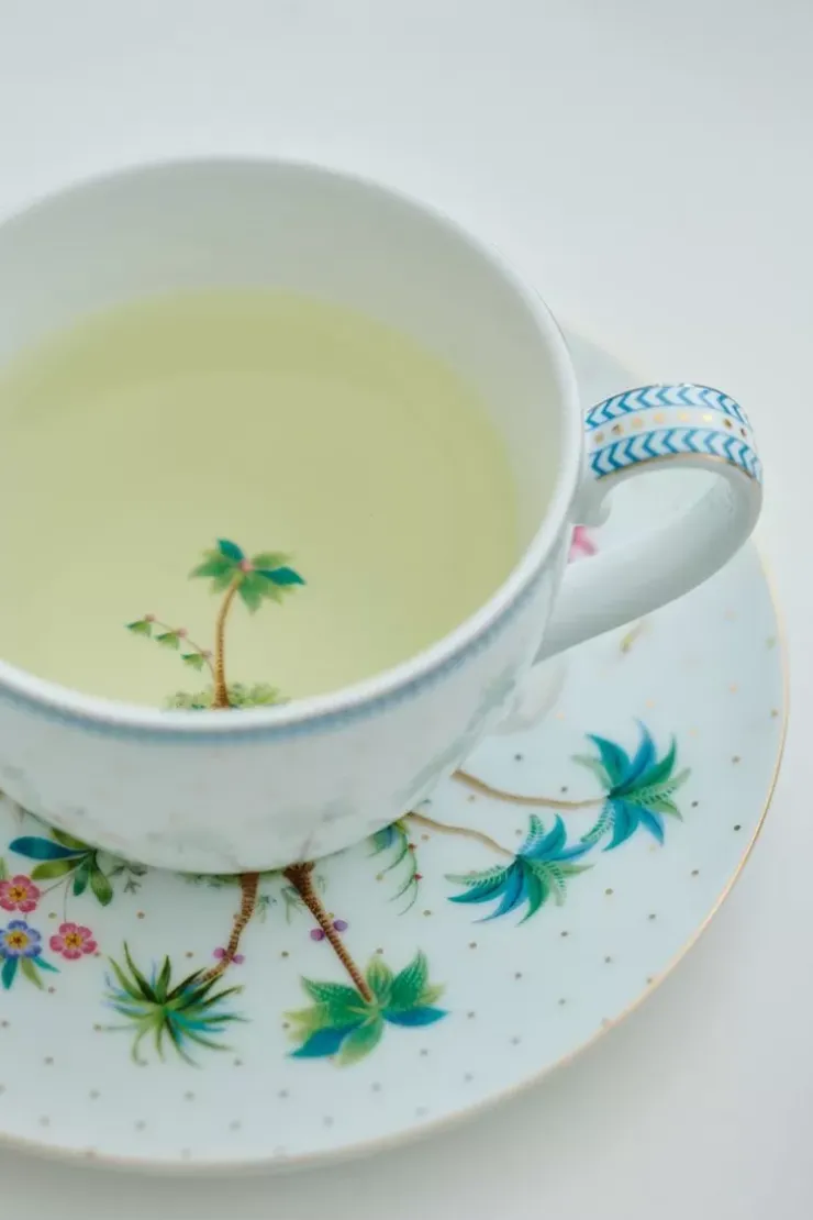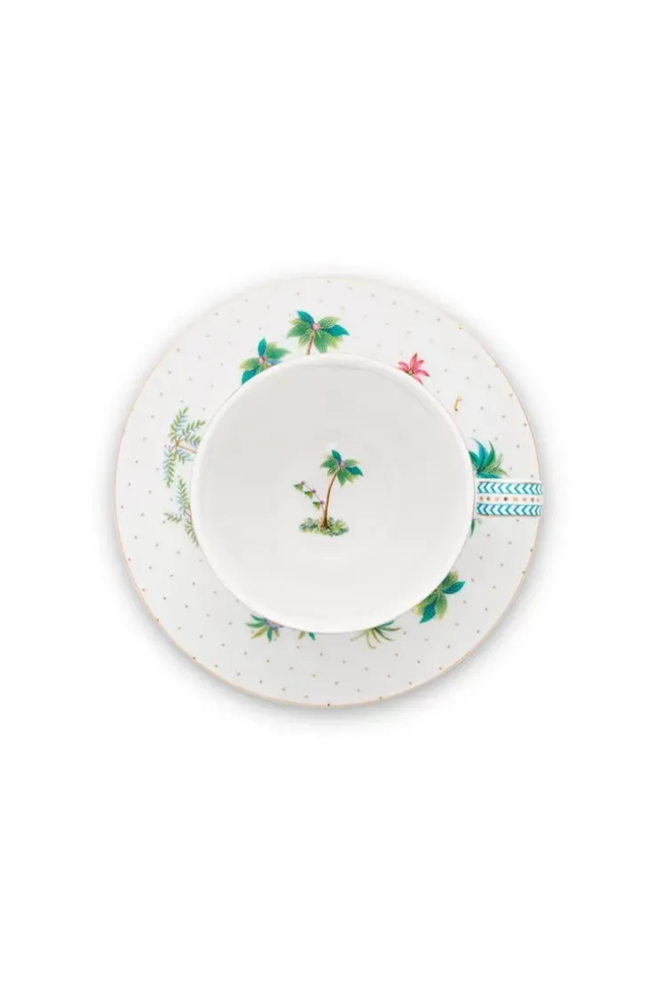 Deze Witte Kop En Schotel Neemt Je Mee Op Reis Naar Een Tropisch Eiland Met Zijn Tropische Design. De Moks Zijn Versierd Met Een Exotisch Dessin. De Schotels Zijn Gedecoreerd Met Gouden Stippen En Hebben Blauwe Details. Hierin Vind Je Diverse Planten, Kleurrijke Bloemen En Soorten. Deze Set Heeft De Perfecte Maat Voor Een Heerlijke Kop Koffie.