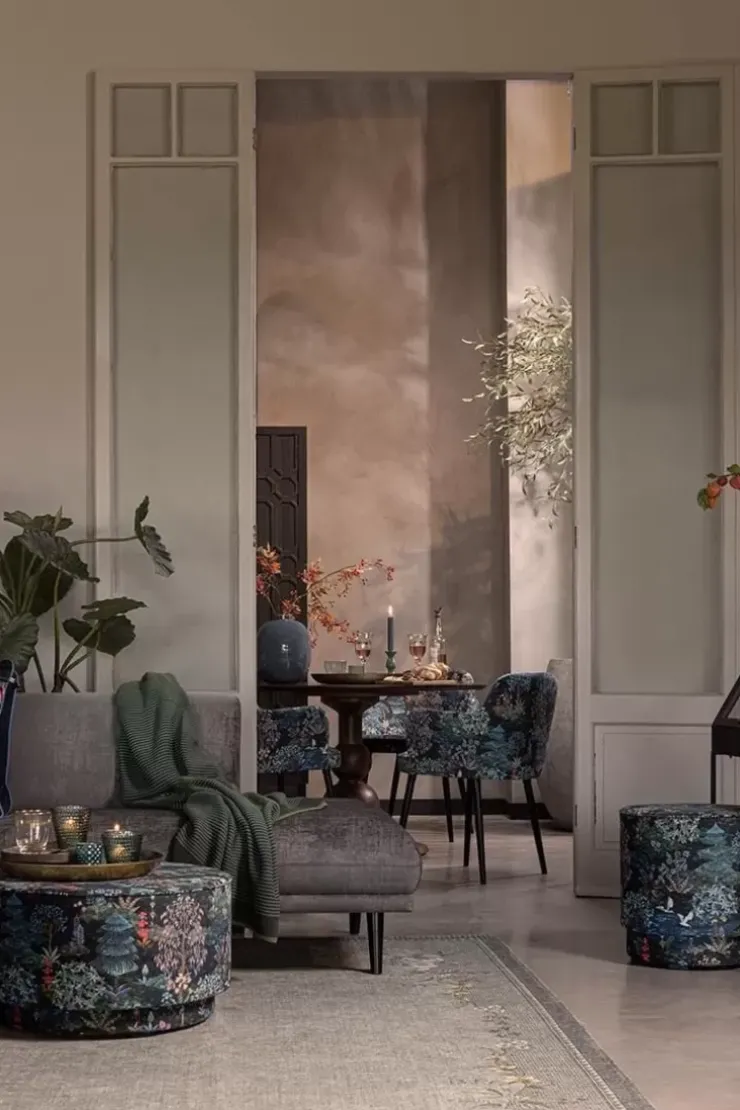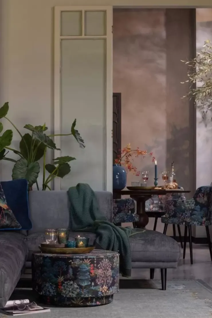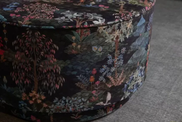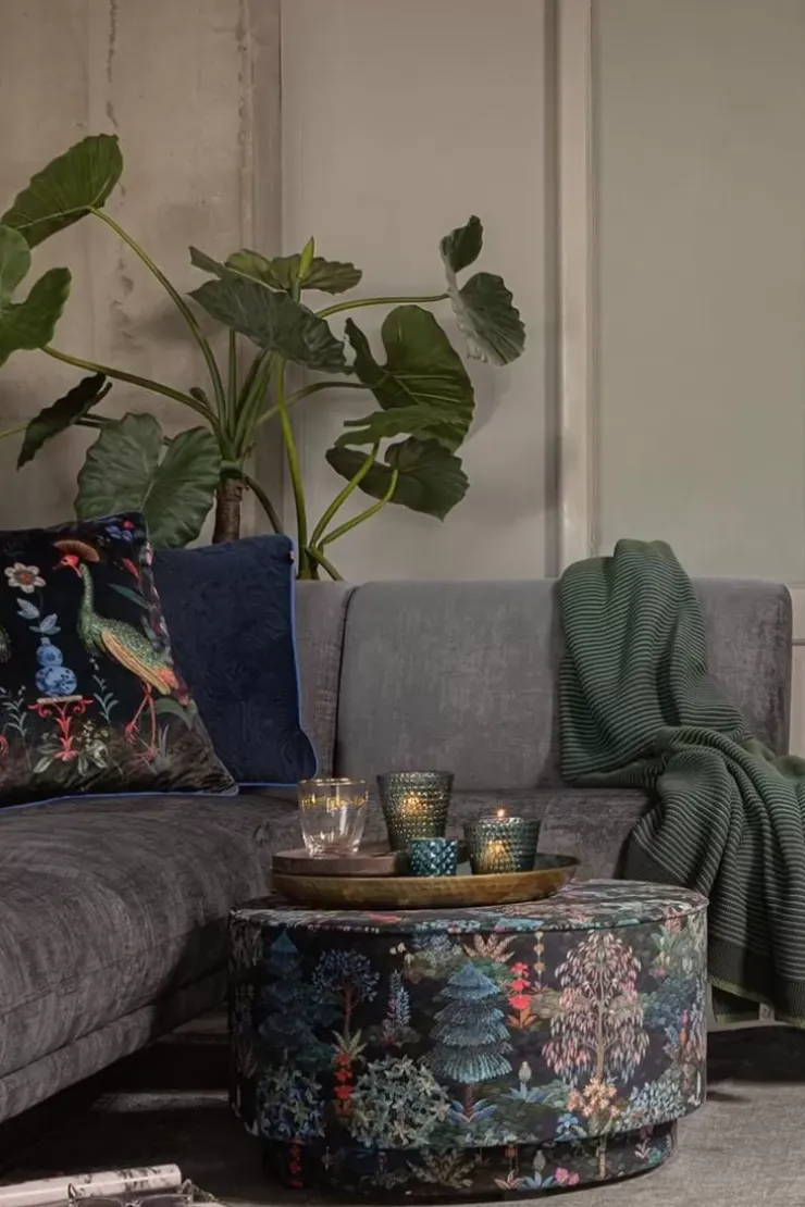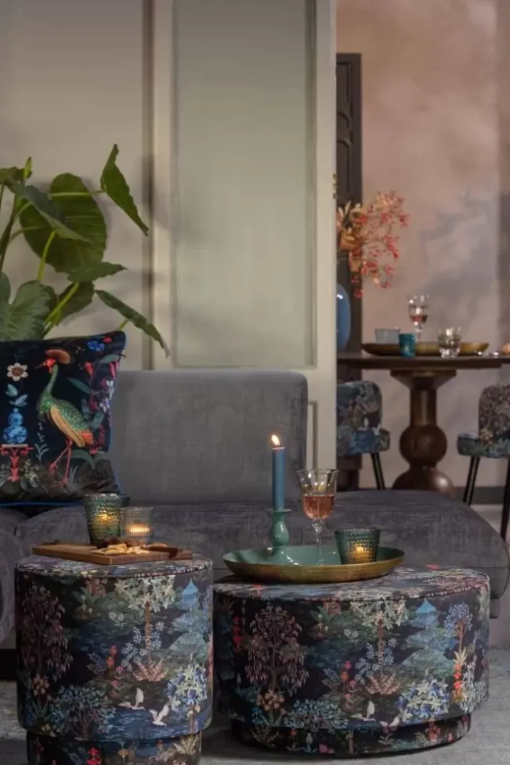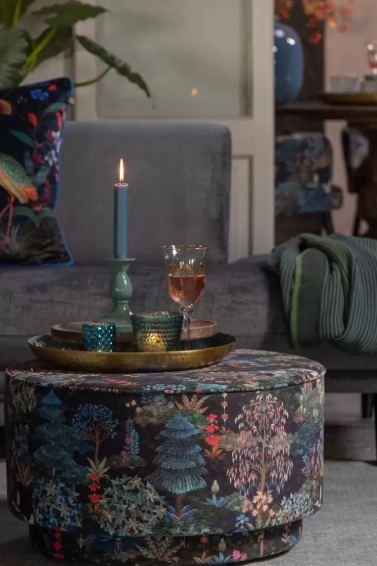 De Large Donkerblauwe Pip Garden Poef Heeft Een Sprookjesachtige Uitstraling. Het Dessin Bestaat Uit Een Variatie Van Fantasierijke Bomen En Kleurrijke Bloemen Gecombineerd Met Prachtige Vogels. Combineer De Poef Met Het Matchende Donkerblauwe Pip Garden Vloerkleed En Maak Er Een Magische Plek Van. De Poef Kun Je Gebruiken Als Zitje Of Om Je Benen Op Te Laten Rusten.