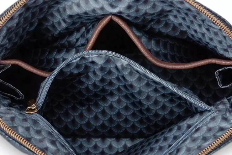 Deze Blauwe Toilettas Is Gemaakt Van Waterafstotend Imitatieleer Dat Volledig Bedrukt Is Met Het Kyoto Festival Dessin. De Toilettas Is Versierd Met Met Een Unieke Variatie Van Fantasierijke Chintzbloemen En Bladeren En Heeft Aan De Onderkant Een Scallop Dessin. Dit Grote Formaat Heeft Een Brasskleurige Ritssluiting Aan De Buitenzijde, Met Binnenin Twee Vakken Er Verschillende Kleine Vakjes. Versierd Met Emaille Pip Embleem.