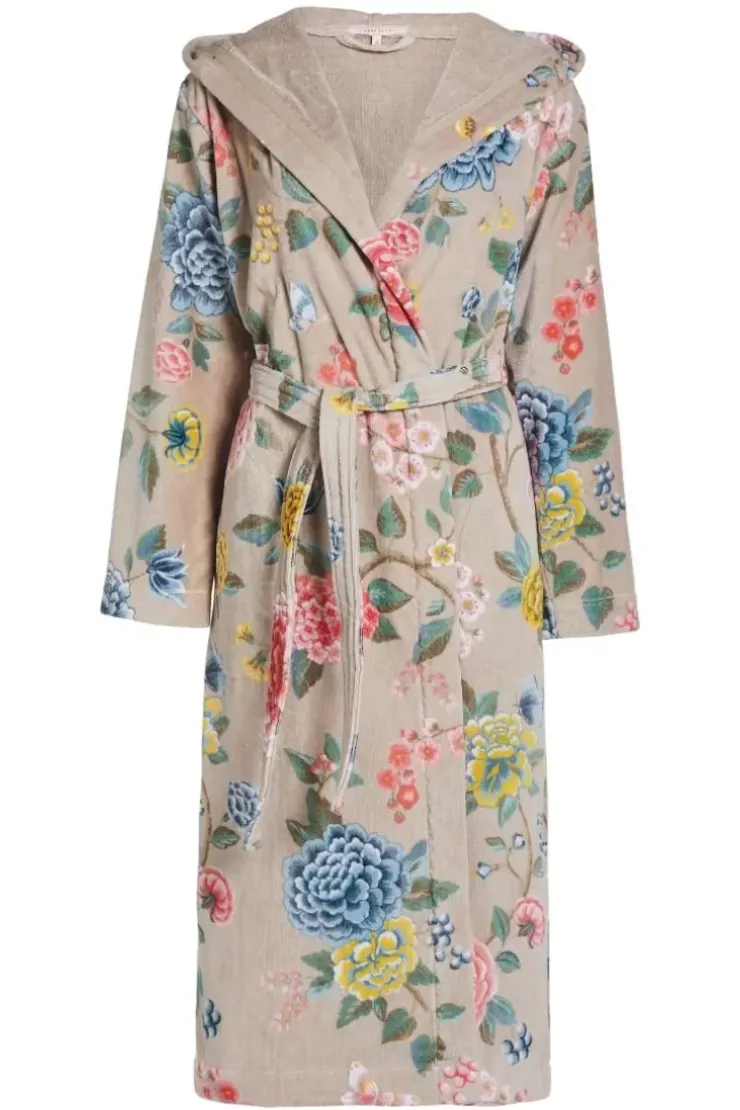 Deze Zachte Khaki Badjas Is Versierd Met Het Good Evening Dessin Vol Kleurrijke Bloemen. De Badjas Heeft Steekzakken En Een Capuchon. De Badjas Dient Voor Gebruik Gewassen Te Worden Volgens Het Care Label.