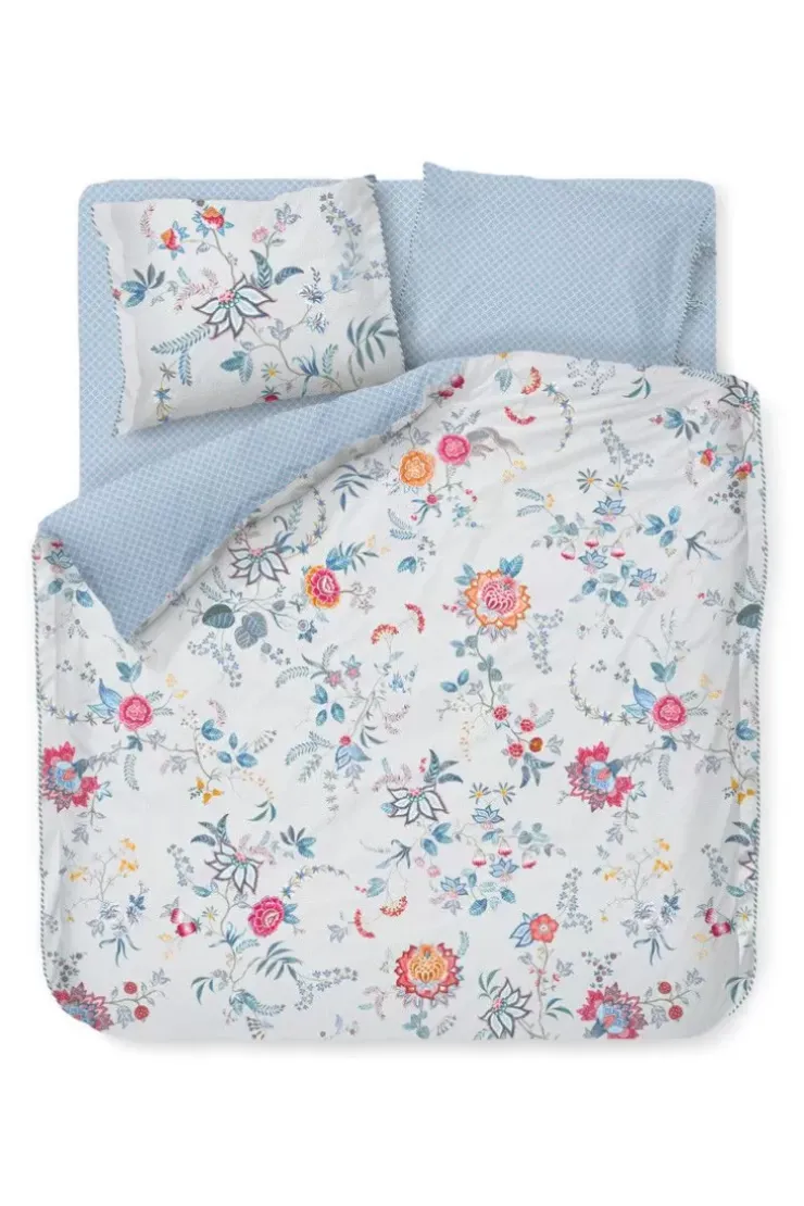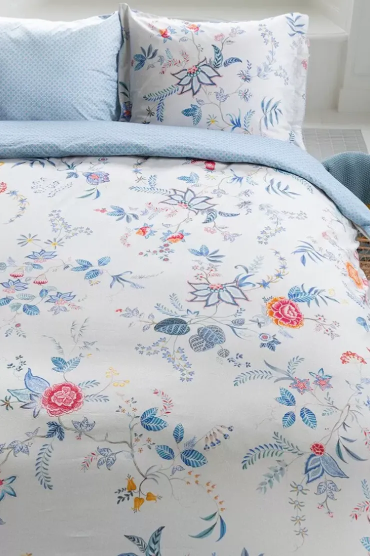 Het Vrolijke Witte Bloemendessin Van Dekbedovertrek Flower Festival Is Opgebouwd Uit Een Variatie Van Fantasierijke Rode En Roze Chintzbloemen Met Lichtblauwe En Groene Bladeren. De Speels Geplaatste Bloementakken Met Grote Gedecoreerde Bloemen En Bladeren Geven Dit Verfijnde Dessin Een Extra Rijke Beleving. De Achterkant Heeft Een Gestileerde Geometrisch Print.