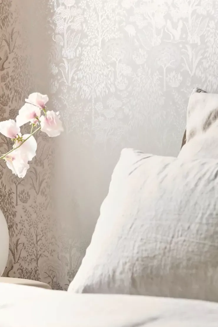 Geef Je Huis Een Betoverende Make-Over Met Het Prachtige Origami Behang In De Kleur Gebroken Wit/Zilver. Het Design Heeft Een Herhaald Patroon Van Uitgewerkte Gestileerde Bomen En Vogels. De Matte Ondergrond Met Metallic Print Geeft Het Behang Een Speciale En Verfijnde Uitstraling. Het Origami Behang Is Verkrijgbaar In Meerdere Kleuren: Licht Groen/Zilver, Oker/Goud, Terra/Rose Goud En Donkerblauw/Rose Goud.